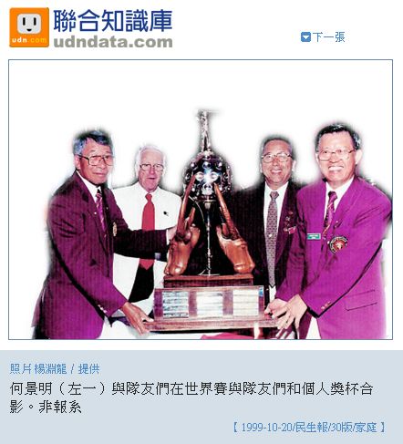 世界各地的老友們對他道賀不絕,因為,這位自從滿了55歲即全勤出席的選手,今年身上自備「18洞」而來(註:是因切除腎臟後縫合傷口的針數),居然可以贏冠軍獎杯。而且是中華民國參賽以來第一個團體冠軍,過去,只有張東燦曾得到過個人冠軍。